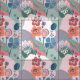 Um padrão floral abstrato em tons mudos de rosa, laranja, azul, verde e roxo.
