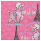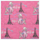 A divertida e moderna design original neste tecido feito sob o costume mostra Mme. Fifi, o trés chic cor-de-rosa Poodle Francês, jantando confiantemente em direção à Torre Eiffel com seu nariz no ar. Tecidos entre estas imagens estão uma variedade de frases em francês e inglês e todos sobre um fundo de cor-de-rosa de morango molhado. Perfeito para o vestido de verão de uma menina, cortinas no quarto de uma garota (para ir com os acessórios do nosso quarto correspondente), um avental, ou...?