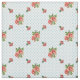 Aglomerados de rosas cor-de-pêssego e roseiras cor-de-rosa pastel em uma diagonal com fundo de bolinhas azul-claro.
