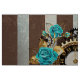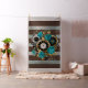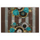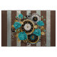 Relógio antigo e patenteado, adornado com joias, mãos de ouro e algarismos latinos com rosa de turquesa sobre fundo castanho e listrado. Estilo Steampunk.