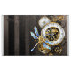 Marcações antigas com engrenagens de ouro e latão, decoradas com libélula mecânica sobre fundo castanho e listrado. Steampunk.