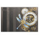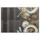 Marcações antigas com engrenagens de ouro e latão, decoradas com libélula mecânica sobre fundo castanho e listrado. Steampunk.
