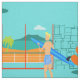 Cada dia pode ser um dia na praia com este tecido retro do gajo do surfista. O estilo dos anos 60, características de design minimalistas da arte sol-beijado, louro, gajo do surfista toda pronto para travar uma onda. Nosso surfista do ajustado está olhando para fora no oceano através das portas de vidro de deslizamento de sua casa beira-mar. Está estando em sua sala de visitas colorida aqua. Nós podemos ver um aqua e uma turquesa, a parede de pedra e o meio século modernos, cadeira alaranjada. No lado oposto da porta de vidro, nós podemos ver um pátio. Além disso, há um ouro, um Sandy Beach, uma palmeira de balanço, sparkling, um oceano do azul de pavão, e um céu do aqua. Na distância, nós podemos ver uma ilha vulcânica da cerceta, que seja dormente pelo momento. O gajo do surfista está guardarando uma prancha azul e está vestindo o azul, shorts modelados tiki do conselho. Trave algumas ondas e compartilhe de algum amor com este design kitschy do verão!