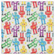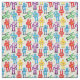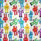 Tecido com padrão colorido coberto com robôs e aliens retrorreflectores vermelhos, azuis, roxos, amarelos e verdes em branco