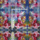 Pintura colorida, branca e artística em acrílico, Papais noeis estão tocando harpa à lua, coruja, ornamentos florais, plantas de inverno, brinquedos para crianças, bagas holly em cores vermelho vivo, verde, branco, azul, amarelo. por Búlgaro Lumini (c)