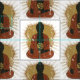 A silhueta de Buddha senta equipado com pernas transversal na obscuridade - veste alaranjada que meditating com o símbolo de Devanagari OM em sua palma! O fundo do protetor do fundo da reticulação cria um presente poderoso contudo calmo de Buddha!