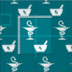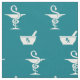 Um tecido feito sob encomenda que caracteriza dois símbolos da assinatura da farmácia uma bacia de Hygenia e um almofariz e um pilão.