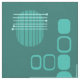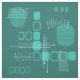 Um design moderno de abstrato-arte que teria ajustado nos anos 50. Várias formas de círculos ovais e linhas em palha escura e turquesa.