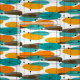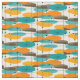 Tecido inspirado moderno do meio século do teste padrão de Starburst na laranja, na cerceta e no marrom em um fundo branco. Os padrões ovais eram populares durante o período de tempo do meio século.