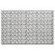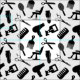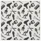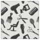 O tecido com um teste padrão preto e branco das silhuetas do cabeleireiro diferente utiliza ferramentas, como tesouras, pentes, secadores de cabelo, etc.