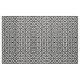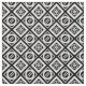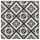 O tecido geométrico à moda caracteriza um teste padrão corajoso de diamantes brancos grossos e finos alternos com espaço entre eles em um fundo preto. Os diamantes grossos cada um contêm um círculo branco fino com um sinal igual branco grosso em um ângulo para dentro. Ao contrário, os diamantes finos cada um contêm um círculo branco grosso que toque em suas bordas com um sinal igual inclinado fino do branco para dentro.