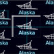 Uma silhueta branca de um trenó de cães em um fundo de estrelas. "Alasca" aparece em azul e branco brilhante.
