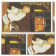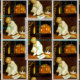 Vintage Halloween ilustra um cartão de saudação mostrando uma criança "assustada" por um jack o'lantern na janela.