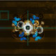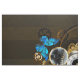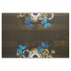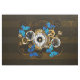Composição do relógio de aço redondo com discagem numérica romana preta, decorado com engrenagens de ouro e latão, borboletas morfo azuis e lentes danificadas sobre fundo listrado castanho. Estilo Steampunk.
