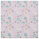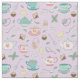 Tecido de festas de chá da tarde britânica, modelado com xícaras de chá, bules de chá, bolsas de chá e colheres de chá sobre um fundo de lilás pálido