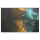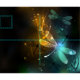 Voo de libélula brilhante, verde, desenhada artisticamente, com asas verdes e amarelas transparentes sobre fundo noturno brilhante com plantas pântanas e vagalumes. Dragonfly brilhante.