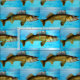 Um pique-walleye está sobre um fundo azul-d'água neste design de pesca divertido.