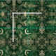 Trendy, modelo floral de caçador de ouro mágico mandala, com uma coleção de penas tribais, flores mandala, flores geométricas, a lua, o sol e as estrelas, círculos, pontos, quadrados, triângulos, chevron zigzag, formas geométricas, uma mandala com um olho de proteção, feita com dourado amarelo e pontos prateados brilhando brilho místico, um fundo verde de floresta, esmeralda, verde gradiente, verde, brilhante. Esta tendência, mística, tribal, moda, design boêmica, é perfeita para o veste diário, decoração caseira, celebrações e decorações de temas de dias especiais.