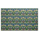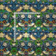 Tecido de uma tapeçaria do William Morris, Art Nouveau intitulada "O Ladrão de Morangos", de aves estilizadas, flores, morangos e folhas, digitalmente melhorada e colorida em tons suaves de azul, verde, bege e bronzeado sobre um fundo azul-índio escuro