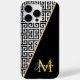 Linha de efeito fotográfico de folha metálica diagonal com um padrão geométrico grego clássico num dos lados e um design monograma personalizável em preto sólido no outro. Crie seu próprio caso de monograma personalizado. Tente uma fonte ou cor diferente no sistema para se adequar ao seu estilo pessoal.