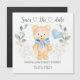 Este design apresenta um urso de pelúcia amigável com arco azul e balão cardíaco. Ele está cercado por folhagem verde. Textos Salvar a data é gravada no estilo de caligrafia.