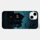 Casa assustada sob uma lua de cheio com morcegos voando através do céu noturno. Halloween clássico assustador.