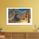 Impressão estendida de tela original de guache pintando "Santa Família no Resto" por Veronica V. Jones. A pintura retrata uma cena da Natividade, mostrando a Mary descansando enquanto José se preocupa com o bebê Jesus em uma mangueira.