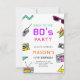 Vamos volta para o anos 80! Este convite de aniversário colorido com um tema retrô é perfeito para festas de vintagem de qualquer idade! Apresentando cores brilhantes, formas geométricas e itens legal inspirados em anos 80 como celular, óculos escuros, fita cassete, auto-falantes e televisão. Este design moderno é um sucesso para os anos 80 ou festas de temas discográficos.