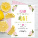 Celebre o seu grande dia com este doce convite para o primeiro aniversário com tema limão! Apresentando limões de aquarelas, fatias de citros cor-de-rosa, e sotaques florais em um pano de fundo branco com chevrons cor-de-rosa, este encantador design dá o tom para uma alegre celebração de verão.