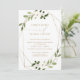 Este convite de casamento tendencioso emparelha uma estrutura geométrica moderna de folha de ouro falsa com a cor d'água eucalipto e buquês florais brancos. Ao lado de um belo roteiro de leite e uma fonte limpa de sans serif, este convite para o casamento é certamente para abençoar todos os seus convidados!