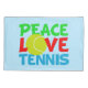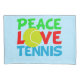 Tênis do Peace Love sobre um bonito fundo azul escrito em vermelho, azul e verde com uma bola de tênis amarelo na palavra LOVE.