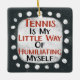 Um design tipográfico irreverente que diz "Tênis é minha pequena maneira de me humilhar". Ele apresenta texto preto e vermelho em um retângulo branco com pontos brancos engraçados e lúcidos ao seu redor, todos em um fundo de cinza escura.