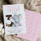 Este convite apresenta um elefante cor-de-rosa para uma terceira festa de aniversário. Voltar a convidar tem um padrão rosa de gingham. Personalize o convite com seus detalhes e você tem as opções para comprar convites impressos ou um download digital.