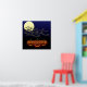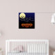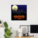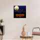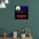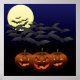 Três lanternas de Halloween com morcegos voadores sobre um fundo escuro iluminado pela lua.