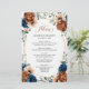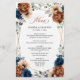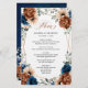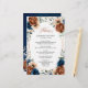 Elegante cardápio de casamento com tema floral terroso laranja, azul marinho, apresentando um buquê elegante de rosas azul marinho, peônias cor de terracota e folhas verdes de eucalipto. Por favor, entre em contato comigo para obter ajuda na personalização ou se você precisar de qualquer outro produto com este design.