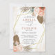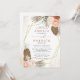 A design apresenta flores de pêssego aquáticas e folhagem de cor terracota em torno de um quadro de hexágono dourado moderno. Na parte de trás do cartão está uma parede floral de bolos pendurada com um monograma personalizado.