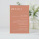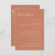 Esta é a modelo de carta de Inserção de Casamento de Terracotta Moderna, que adicionará um toque de elegância à sua decoração Festa de casamento, e as sombras de ferrugem e deserto serão excelentes para o Casamento outono. Todo o texto é editável, basta clicar em 'Personalizar este modelo' e depois em 'Personalizar mais'. Itens correspondentes, incluindo cartão de convite e cartão RSVP também disponíveis.
