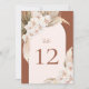 Esta carta de número de mesa de casamento de tamanho maior é perfeita para casamentos de outono, e apresenta um arco geométrico decorado com buquês tropicais de grama pampas, orquídeas brancas, e frentes de folhas de palma secas, com fundo terracota. Encontre produtos correspondentes na coleção ou envie-me mensagens através do Zazzle Chat para mais produtos, ajustes de design ou mais caminhos de cores.