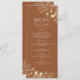 Um menu de casamento simples, moderno, botânico, floral terracotta com um lugar elegante de flores silvestres douradas e um roteiro simples, escrito à mão.