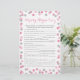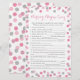 Nosso jogo de teste de rima de berçário de chá de fraldas, cor-de-rosa e cinza, tem 15 frases de rima de berçário com palavras faltando. Peça aos hóspedes que completem as rimas e a quem tiver as vitórias mais corretas. RESPOSTA CHAVE: 1)Fluta 2)Cesta 3)Lã 4)Suíno 5)Muffin Man 6)Clock 7)Filas 8)Pail of water 9)Gordura 10)Ovelha 11)Camundongos 12)Coalhada e soro 13)Jardim 14)Masculinos 15)Esposa do agricultor