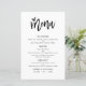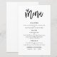Texto do Script de Tendência do Orçamento Apenas Menu de Casamento. Um tamanho maior de 5,5" x 8,5" a um preço orçamentário, em um STOCK CARD SEMI GLOSS de 110 lb, excelente de convites, aproximadamente na mesma espessura de um cartão postal, ou um estoque LINEN elegante de 110 lb - para um luxo, ligeiramente mais fino, com um valor de excelente. OBSERVE QUE OS ENVELOPES OPCIONAIS SÃO UM POUCO MAIORES EM TAMANHO A 6,75" x 9" aprox. Este alternativo de tamanho de orçamento também está disponível em outras opções de papel. O papel FELT de 100 lbs é colorido por buff, NÃO branco, então adiciona um toque rústico. O estoque de papel MATTE de 80 lb é branco brilhante, para impressão nítida, excelente para seus menus e programas, enquanto o papel SATIN de 80 lb é fino e leve, ideal para gabinetes. Uma tipografia informal em preto para o título principal Menu que complementa o resto do texto que você pode facilmente personalizar.