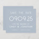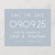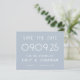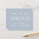 Um alternativo de baixo preço de 4,5 x 5,6" em 110 lb é semelhante em espessura a um cartão postal. Há um por folha. Texto Grande do Orçamento Casamento Azul Salve a data, elegância moderna com esta design de tipografia na moda totalmente personalizável. Personalize facilmente o texto e, se você tiver um site de casamento, gere automaticamente um código QR para ele no verso substituindo o URL de amostra para o URL do seu site de casamento. Você pode excluir o código QR de amostra se não for necessário por meio da opção editar mais, onde você também pode editar cores de texto e estilos e cores de fundo em cada lado, se desejar.