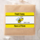 Uma abelha alegre está no centro desta etiqueta de mel. Você pode editar o texto para criar sua mensagem personalizada. O texto de exibição diz 'Fresh Honey NET WT.16 OZ. Nome da Fazenda. O texto é preto.