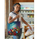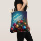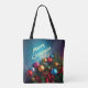 Saco de Tote de Natal de médio porte com Texto Personalizado Personalizado. Decoração colorida sobre fundo azul profundo. Personalize esta bolsa com o seu próprio texto.