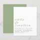 Um valor para o alternativo do ORÇAMENTO em tamanho menor de 4,5 x 5,6" de semirbrilho de 110 lbs, que é de espessura semelhante a um cartão postal (no entanto, não é adequado para uso como cartão postal). POR FAVOR, OBSERVE QUE HÁ UM convite por folha Simple Text Sage Green Wedding Invitation. Simples e Informal, seus primeiros nomes são grandes em na moda em minúsculas com os detalhes embaixo. Personalize facilmente o texto.