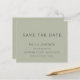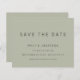 Texto Simples Verde Do Sage Salva A Data. Um alternativo de 4,5 pol x 5,6 pol com preço inferior. Disponível em um STOCK DE CARTÃO SEMI-GLOSS 110 lb, que é a opção padrão (mais espesso para convites), OU um STOCK de PAPEL THINNER FINISH 80 lb FINISH (ideal para gabinetes). Os envelopes são um extra opcional e são ligeiramente maiores que o tamanho da placa. Simples elegância com Salvar a Data em um script de conjunto moderno.O resto do texto que você pode personalizar facilmente.Mostrado aqui em preto no verde de sábio suave, no entanto, as cores de texto e plano de fundo podem ser alteradas se você desejar por meio da opção personalizar mais.