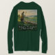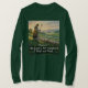 This t-shirt features a digital illustration of Jesus as a shepherd standing with his flock in a pastoral landscape at sunset. He wears a brown cloak over a white robe and holds a wooden staff. The sheep are beige-colored and lined up following the shepherd. The setting features rolling green hills, a winding river and distant mountains under a golden sunset sky with wispy clouds. The foreground includes tall grass and purple wildflowers. The text Psalm 23:1 - The Lord is My Shepherd; I Shall not Want appears in white at the bottom of the image. The t-shirt is a forest green long sleeve women's t-shirt made of 100% cotton.