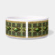 Tons verdes e dourados com joias e rolhas que lembram a arte asteca embelezam esta tigela para seu animal de estimação. Este design único está disponível tanto no tamanho do prato do cão como do gato. A área de texto no medalhão de frente está pronta para você se personalizar com seu nome de gato ou cão.