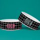 Padrão moderno geométrico monocromático com uma tigela de animais de companhia personalizável de texto azul-gelo, acessório fofo. Presente ideal para o dono do animal de estimação em sua vida, personalizado com nomes em preto e branco e azul pastel