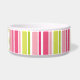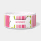 Esta bacia cerâmica do alimento para cães tem um teste padrão do rosa, do fúcsia, o verde e o branco das listras no fundo. No meio, há um grande osso branco com um nome facilmente personalizado de seu cachorrinho escrito no rosa quente.